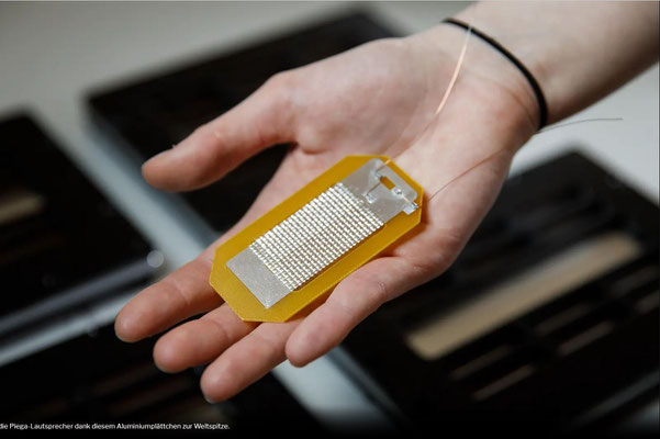 Die PIEGA Bändchen-Hochtöner sind bereits seit der Firmengründung Bestandteil unserer Geschichte. Der Hochtöner fand ein breites Echo in der Fachwelt und wurde in den letzten drei Jahrzehnten stetig und bis zur Perfektion weiterentwickelt. Durch seine Detailgenauigkeit und den Wirkungsgrad übertrifft das Bändchen deutlich die Leistungsfähigkeit eines konventionellen Kalottenhochtöners. Möglich werden diese exzellenten Klangeigenschaften durch eine 26 x 42 mm grosse, aus einer hauchdünnen Aluminiumfolie bestehende Membran. Die bewegte Masse beträgt nur sieben Milligramm und ist damit rund 30mal geringer als bei den leichtesten handelsüblichen Kalottenhochtönern. Die Membran beinhaltet zwei Flachspulen, die in einem sehr aufwändigen Sprühnebel-Ätzverfahren aufgebracht werden. Angetrieben wird sie durch einen hochkomprimierten Neodym-Magneten sowie in die Frontplatte integrierte Magnetstäbe, die wie magnetische Linsen funktionieren. Sie bündeln die magnetischen Feldlinien, wodurch der Hochtöner einen Kennschalldruck von mehr als 100 dB erreicht. Das hörbare Ergebnis: ein besonders klares und extrem detailreiches Klangbild.